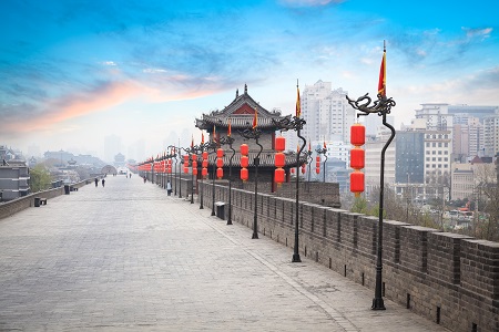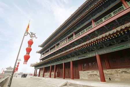 중국에서 보전하고 있는 건축물중에서 가장 완정한 고성 중의 하나입니다. 성벽은 방어용 목적으로 만들어졌으며, 동서로 길쭉한 장방형입니다. 전체 둘레 13.75km입니다. 성내의 면적은 총 12평방킬로미터로 당나라 장산성의 7분의1 정도의 크기입니다. 서안성벽은 입장료를 받고 오를 수 있게 되어 있으며 넓은 성을 둘러보게 하기 위해 유료 자전거 대여와 유료 전동차도 운행합니다.