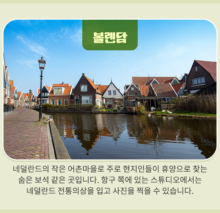 집이 대부분 흰 테두리의 목조 건물로 되어 있으며, 마을 곳곳에 크고 작은 풍차들이 흩어져 있어 마치 동화 나라 같은 분위기를 자아냅니다. 멋진 풍차를 촬영하려면 정면보다는 약간 측면을 촬영해보는 건 어떨까요? 정면은 바람에 돌아가는 날개만 보이지만, 측면은 아름다운 풍차를 다 촬영하실 수 있습니다.