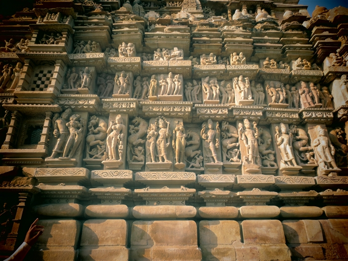 인도를 대표하는 유적지 중 가장 에로틱한 사원으로 유명한 사원으로 사원 외벽에 수많은 에로 조각(미투나)은 정도가 심히 지나쳐 관광객들의 시선을 자극합니다. 일반적으로 종교에서 금기시하는 성행위 조각이긴 하나, 섬세함과 작품성이 보는 이로 하여금 절로 감탄을 자아내게 합니다.