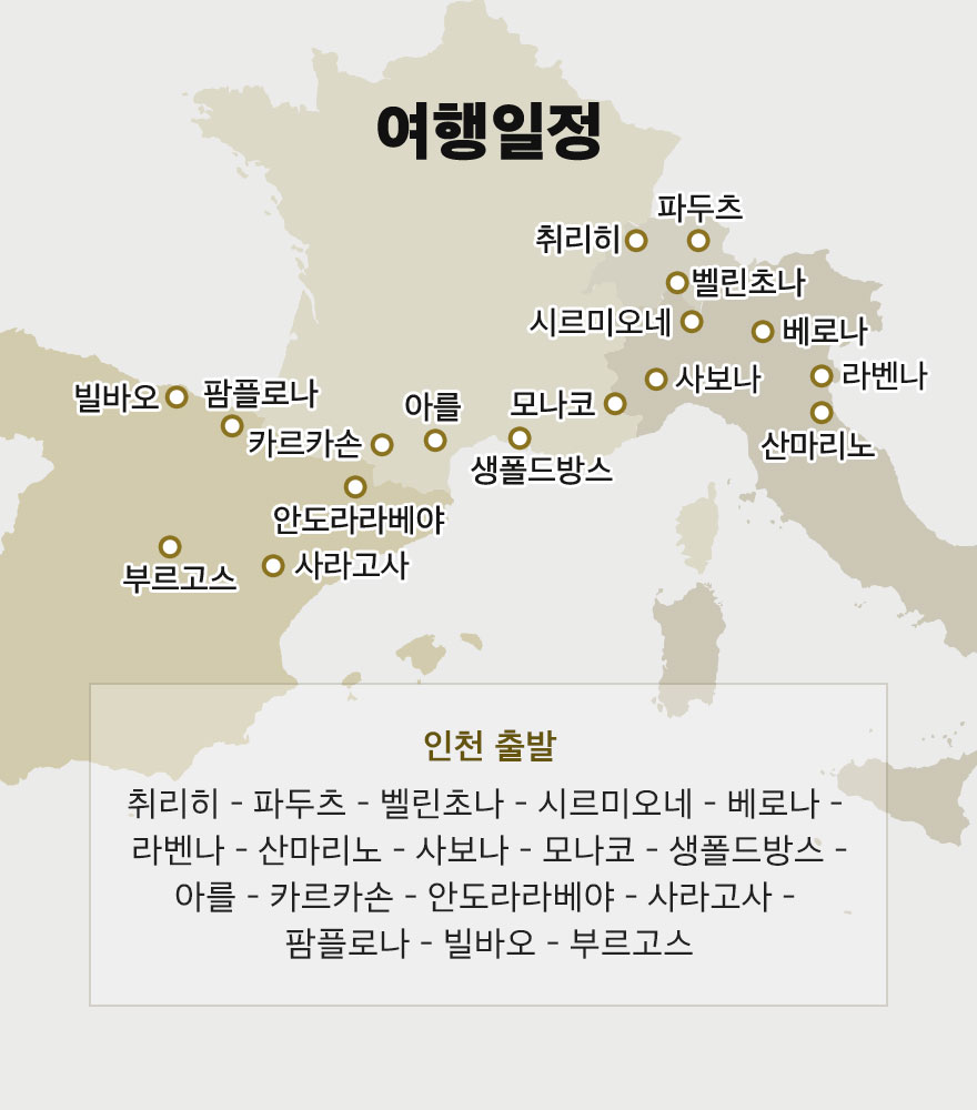 취리히-파두츠-벨린초나-시르미오네-베로나-라벤나-산마리노-파르마-사보나-모나코-니스-생폴드방스-아를-안도라라베야-사라고사-팜플로나-빌바오-부르고스-마드리드