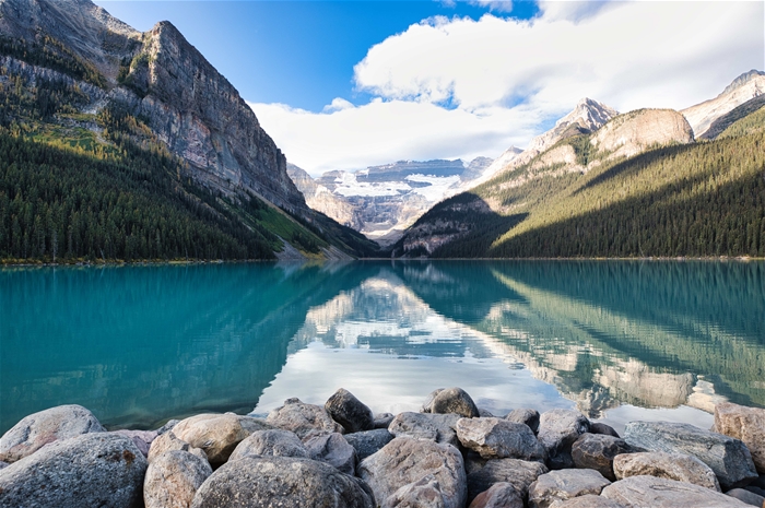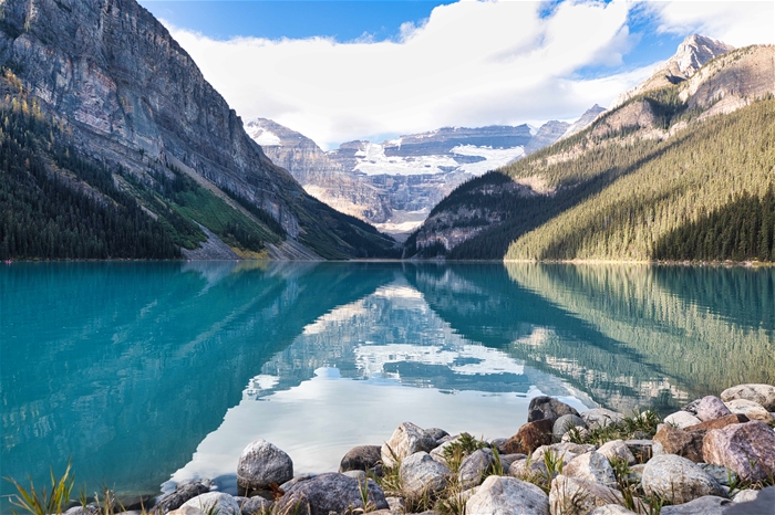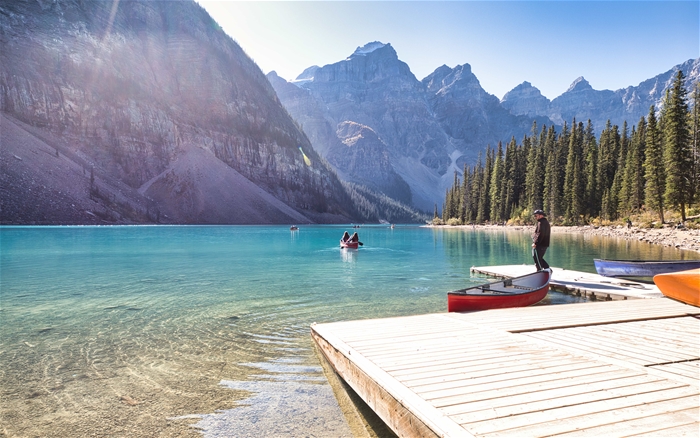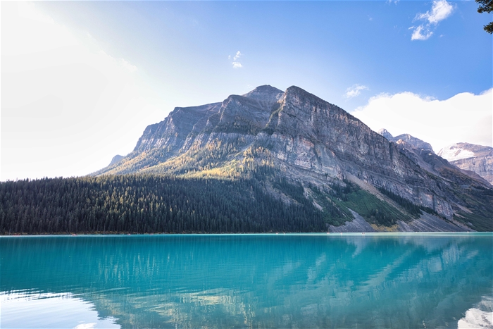 높고 거대한 빅토리아 산이 맑고 투명한 에메랄드 호수를 감싸 듯 빙 둘러 있고 정면에 만년설 빙하가 산위에 있는데 아침에 사선으로 내리는 태양빛이 우측 능선을 비춥니다.