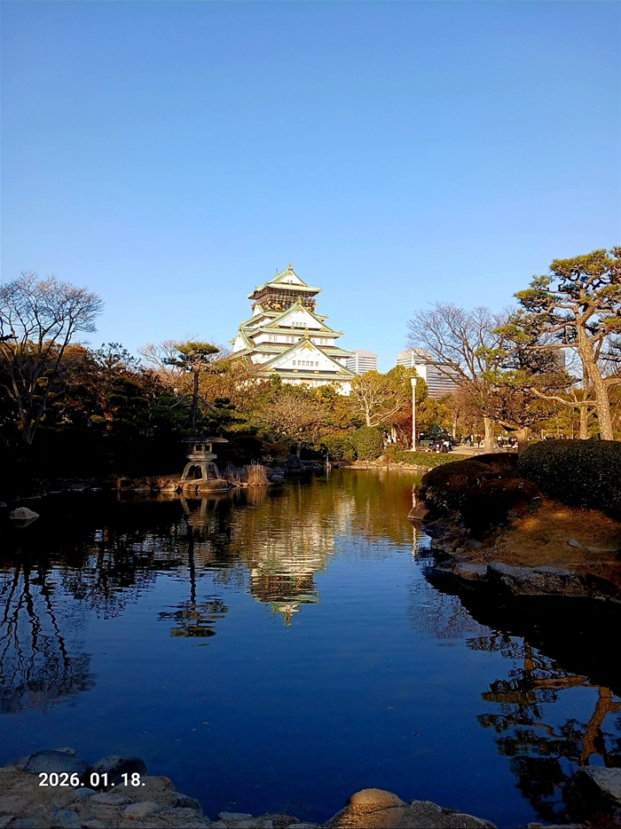 오사카성에 대한 가이드님의 설명을 듣고 관람을 했습니다. 오사카성을 배경으로 기념촬영을 해주시는 가이드님을 뒤로 하고, 가족끼리 둘러보았습니다. 천수각은 유료입장인데 따로 들어가보지는 않았습니다. 아이들은 나중에 커서 기회가 닿으면 직접 볼 수 있겠죠. 성을 작게 한바퀴 돌다보니 천수각 뒤의 2차대전시 폭격으로 틀어진 축대도 구경하고, 이곳 저곳에서 사진을 찍고, 공연하는 사람 구경도 하고 그랬습니다. 둘러보고 나오다 사람들이 모여 있어 가보니 풍경 사진을 찍고 있어 저도 한 장 찍었습니다. 연못 한 켠에서는 외국인 한 명이 담배를 몰래 피우고 있었는데 눈을 마주치니 멋적게 웃네요. 오사카 성 내에는 토요토미히데요시를 모신 신사가 있어서 잠깐 들러서 구경했습니다. 아이에게 이런 저런 설명을 해주고 나왔습니다.
