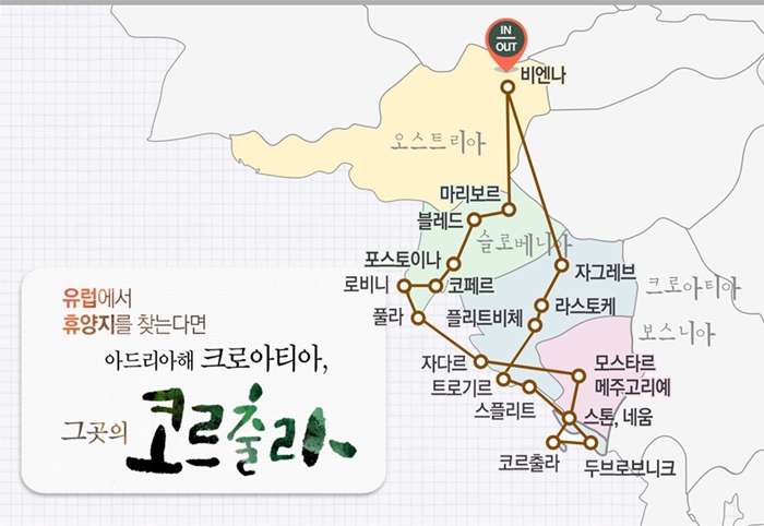 인천-밀라노-비첸차(1)-포스토이나-블레드-트레브네(1)-자그레브-라스토케-플리트비체(1)-트로기르-스플리트-네움(1)-코르출라-스톤-두브로브니크-네움(1)-모스타르-메주고리예-자다르-오토칵(1)-풀라-로비니-브루네라(1)-베니스-밀라노-기내박(1)-인천