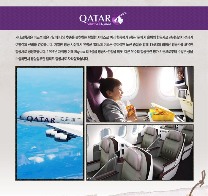 내용보기카타르의 국영 항공사이자 국책항공사입니다. 도하를 경유지로 허브 네트워크를 운영하고 있습니다. 최신 에어버스 A340, 보잉 777 기종의 진보된 안락함과 300여명의 한국 승무원들을 포함한 1,000 여명의 손길로 전해지는 전 세계 여섯 개 밖에 없는 5-Star 항공사의 특급 서비스가 제공됩니다. 두바이에서 열린 World Travel Awards 에서 4년 연속으로 '최고의 중동지역 비즈니스 석 상'을 수상했으며 7년 연속으로 '최고의 중동지역 캐빈크루 상' 을 수상하였습니다. 더불어 지난 10년 동안 매년 35%의 성장률로 네트워크를 넓혀 가고 있습니다.