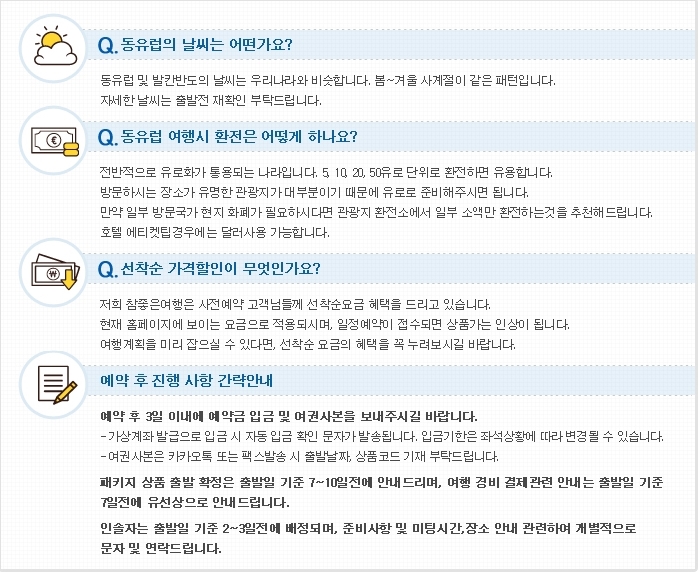 ■ 1인당 90유로의 가이드/기사경비를 현지에서 지불해야 합니다. ■ 개인적인 음료비용 , 물값, 객실 TIP, 선택관광 비용 등 ■ 유류할증료는 매월 변동가격으로 적용됩니다. ■ 선택관광안내 - 일정표 하단 참조 ■ 국외여행 표준 약관 제12조 여행요금의 변경 참고 - 국외여행을 실시함에 있어 이용운송, 숙박기관에 지급 해야 할 요금이 계약체결시보다 5%이상 증감하거나, 여행요금에 적용된 환율이 계약체결시보다 2% 이상 증감한 경우 여행업자는 그 증감된 금액을 상대방에게 청구할 수 있습니다. -본 상품은 2018.06.01 하나은행(구 외환) 기준 '1유로당 1278원 현찰 살때 마감환율을 기준하고 있으며, 출발일 15일전 환율조건 1,304원 이상으로 마감시 기획당시 환율의 증감율만큼 추가금액이 발생될수 있습니다. ■ 결제조건과 관련한 자세한 내용은 전화문의 바랍니다. 이 상품은 현금납부, 카드결제가 가능합니다. 다만, 이 상품이 현지 업체에 대한 선착순, 특가요금이 적용되는 상품인 관계로 원활한 예약을 위하여 가급적 현금납부를 부탁 드립니다. ■ 기내 좌석 배정은 항공사의 고유 권한으로 인솔자와 여행사의 귀책사유가 없음을 알려드리며, 고객님이 희망하시는 좌석으로 배정이 안 될 수 있음을 널리 양해 부탁드립니다. 사전 좌석 배정이 가능한 항공사의 경우, 출발 2~3일 전 전자 항공권(e-티켓)을 받으시고 고객님께서 직접 웹 체크인을 통해 좌석 지정받으시길 권해드립니다. |