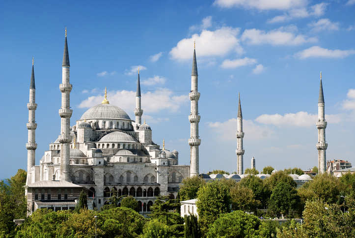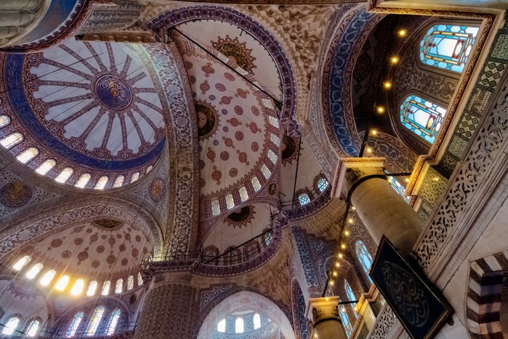 이스탄불의 상징이자 비잔틴 건축의 최고봉은 아야소피아입니다. 터키를 점령한 오스만 제국은 기독교 성당이던 아야소피아를 이슬람 사원으로 개조했습니다. 여기에 성이 차지 않았는지 오스만 제국의 사람들은 바로 건너편에 아주 비슷하게 생긴 아름다운 사원 하나를 더 지었습니다. 그것이 바로 '블루모스크'라는 별명을 가진 술탄 아흐메드 모스크입니다. 사원 안쪽을 2만개의 푸른색과 녹색 타일로 장식했기 때문에 해가 막 뜬 아침이나 해질녘에 가면 빛에 반사된 타일이 황홀한 파란 빛을 만들어냅니다. 터키의 이슬람사원으로는 유일하게 6개의 첨탑이 세워져 있는데 첨탑의 갯수는 사원의 레벨을 결정하는 요소이기 때문에 건설 당시 논란이 일기도 했습니다. 당시 사원 건설을 지시한 황제가 금(Altin)으로 만든 첨탑을 세우라고 지시하고는 예루살렘으로 순례를 갔는데, 금을 조달할 수 없었던 건축가가 금이 아닌 6개(Alti)로 잘못 듣고 세웠다고 변명했다는 일화가 있습니다.