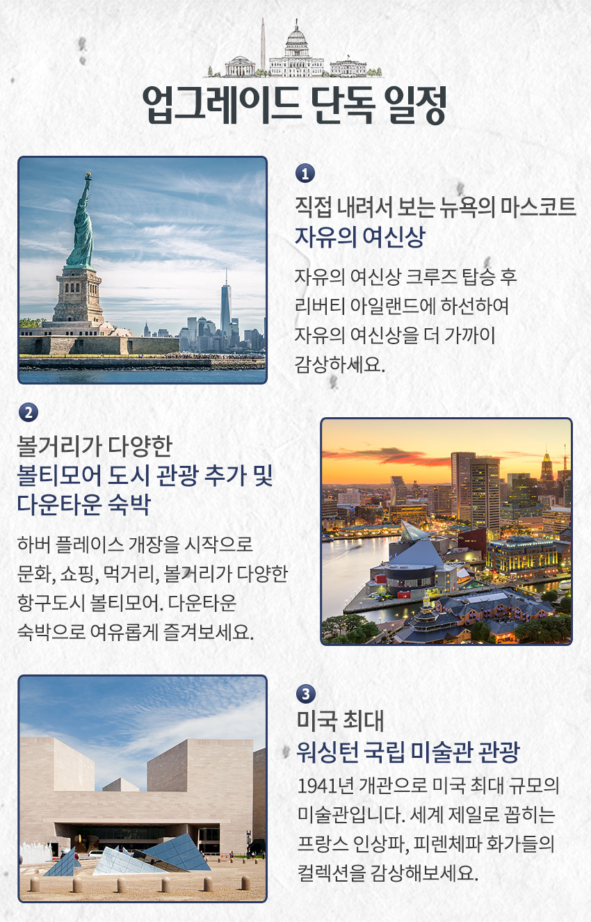 | 3 | 뉴욕 야경 추가관광 | 화려한 불빛과 함께 밤거리의 또다른 매력을 느낄 수 있는 뉴욕 야경 추가관광 프로그램입니다. | US$40 | 약 1시간 30분 | 참여를 안하시는 고객님들은 호텔로 이동합니다. | 호텔 | 미동행 |