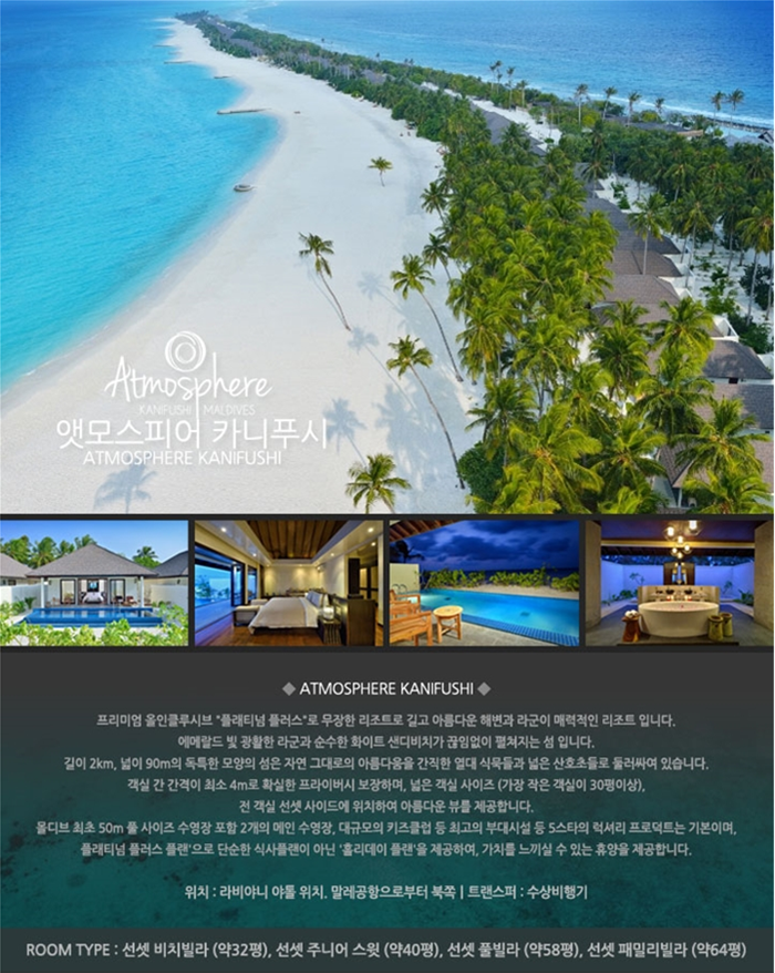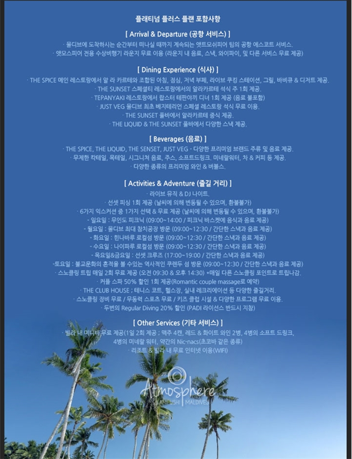 ▶ 왕복 항공권, 유류할증료 & 택스 ▶ 몰디브 공항- 리조트 간 왕복 트랜스퍼 ▶ 1억원 여행자 보험 ▶ 일정에 명시 된 리조트 포함사항 |
