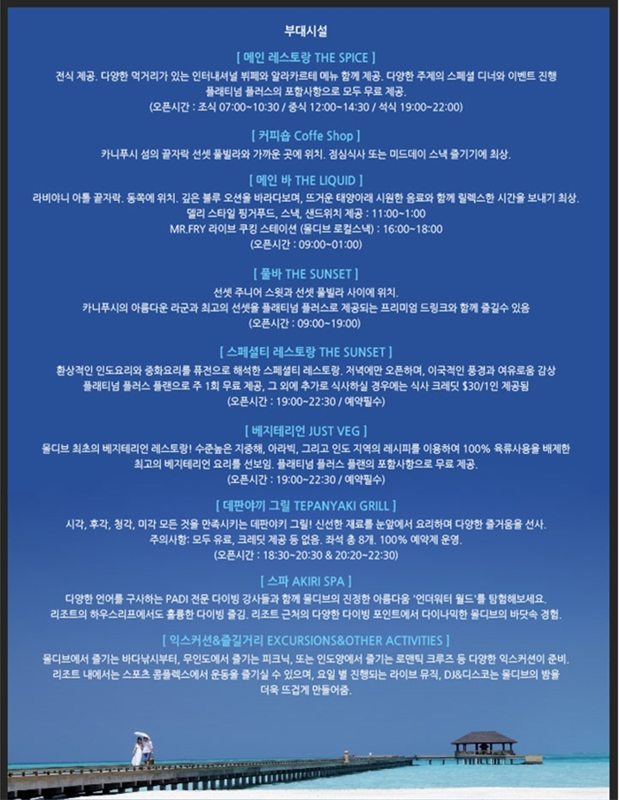 - 시간 : 17:30~ 20:30 (리조트별로 약간의 시간 차이가 있습니다.)