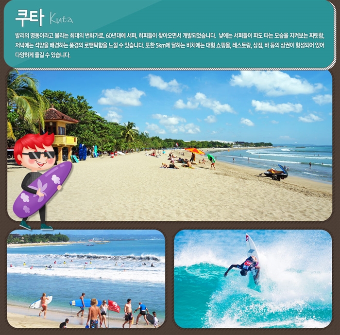 비치를 따라 형성된 발리 제1의 번화가이자 여행자의 천국입니다. 레스토랑, 백화점, 상점, 바 등이 많아 볼거리 놀거리가 많으며,작은 사원들도 쉽게 볼수 있습니다. 유럽의 젋은 서퍼들과 타 지역의 관광객으로 늘 활기찬 거리입니다.