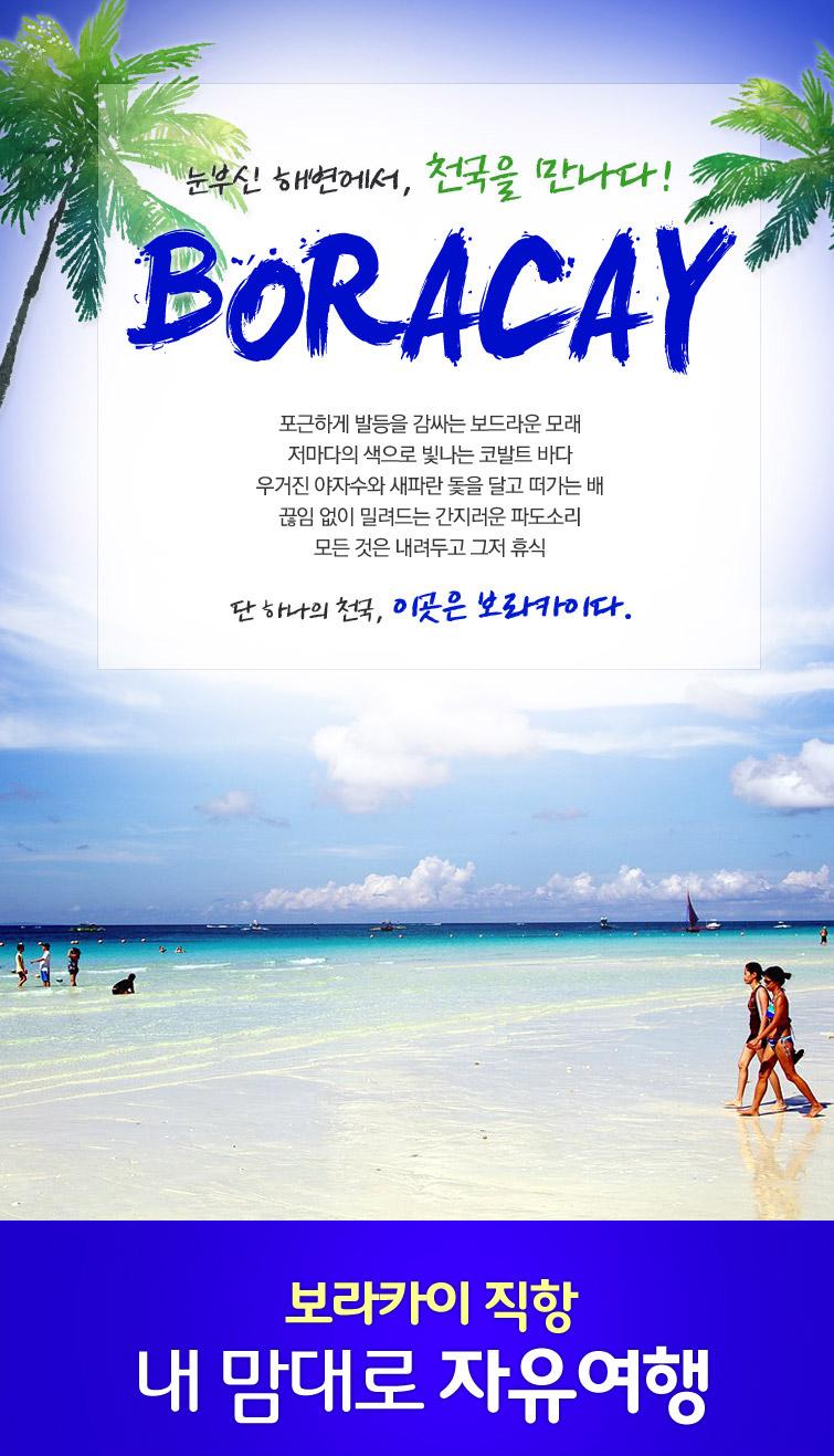세계 3대 해변으로 꼽히고 있는 보라카이는 필리핀의 중서부 파아니섬 북서쪽에 떠 있는 섬으로 마지막 남은 천국이라 불릴 만큼 때묻지 않은 자연을 지닌 휴양지입니다. 길이 7㎞에 달하는 길고 넓은 화이트 비치와 야자수 숲이 어우러진 지상 낙원, 최고의 휴양지랍니다.