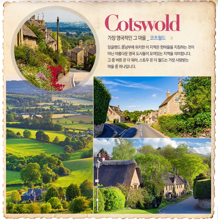 영국 특유의 전원풍경이 그대로 보존되고 있는 아름다운 마을입니다. 영국인들이 은퇴 후 살고 싶은 곳으로 선정되기도 했습니다. 코츠월드 이름은 '양 떼와 오두막집이 있는 언덕'을 의미합니다. 과거에 이 지역 사람들이 양을 키우면서 생활한 것에서 유래되었습니다. 코츠월드 지역 중에서도 특히 아름다운 전원마을 바이버리(Bibury), 버튼 온 더 워터(Bourton-on-the-water), 스토우 온 더 월드(Stow on the world)를 방문하는 관광객들이 가장 많습니다.