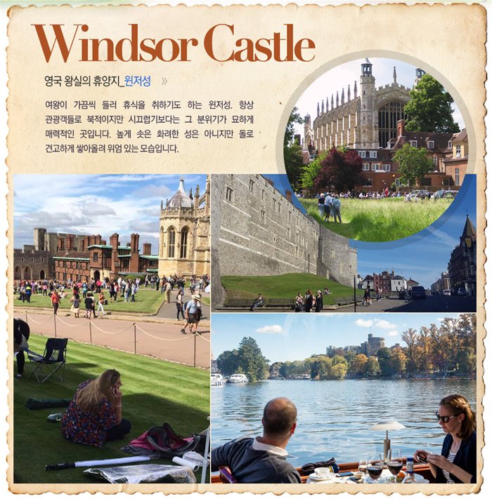 윈저성(Windsor Castle)은 여행자에게 가장 인기있는 영국의 명소입니다. 런던 근교에 위치하여 언덕 아래에는 템즈강이 흐르고, 강 반대편으로는 영국의 명문 학교 이튼 칼리지가 보입니다. 윈저성은 드넒은 정원과 성벽, 탑으로 구성되어 있습니다. 이들은 세월과 함께 어우러진 녹음으로 둘러싸여 아름다운 풍광을 선사합니다. 지금도 성에는 약 250명의 관리자, 성직자 등이 거주하고 있으며, 과거 영국 왕들의 초상화와 왕가의 수많은 보물, 예술가들이 남긴 작품이 있습니다.