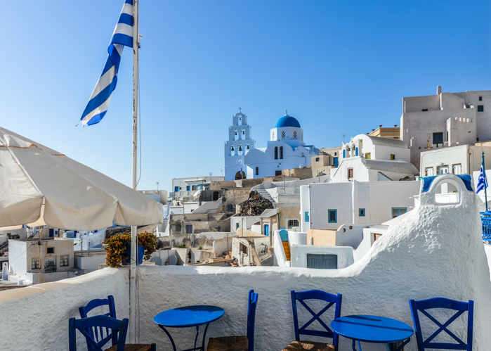 그리스 사람들은 이 곳을 산토리니라 부르지 않고 '티라(Thira)'라고 부릅니다. 이 섬을 수놓은 수 많은 흰색 건물과 파랑색 지붕들은 그리스의 국기 컬러와도 정확히 일치합니다.