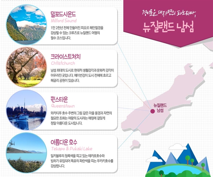 - 이동만 하는 일정은 이제 그만, 꽉차고 여유로운 뉴질랜드 남섬 일정 가능!