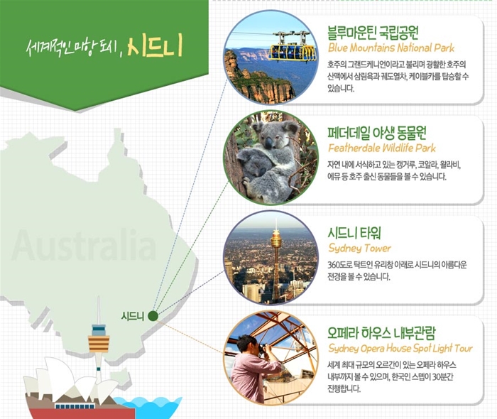 | 2 | 시드니 야경투어 | 시드니의 아름다운 야경감상 (음료제공) | AUD$60 | 3시간 | 호텔 휴식 | 호텔 | X |