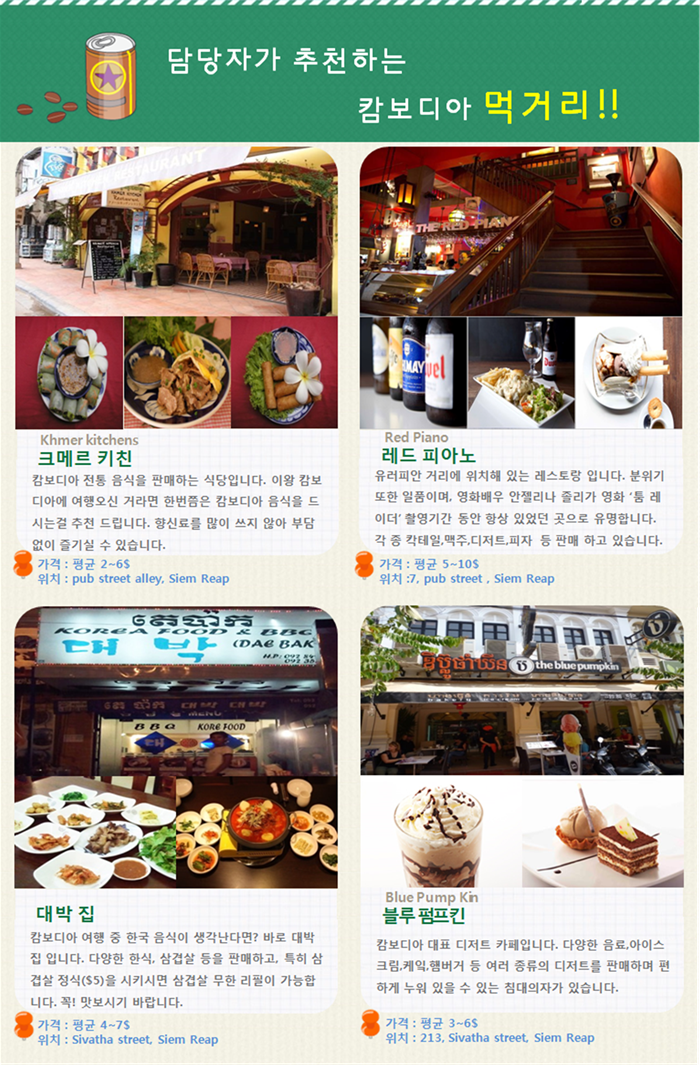 1.캄보디아 비자비용 $30+사진 1장 준비해주세요. (여권용사진 혹은 증명사진) 2.개인경비, 매너팁 3.왕복 픽업 서비스 |