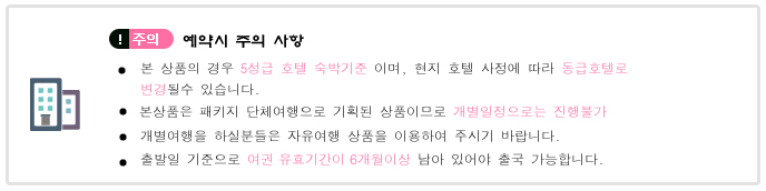 | 대기예약 | 출발확정 상품으로, 예약 접수 후 항공/호텔 추가 수배 예정 | |