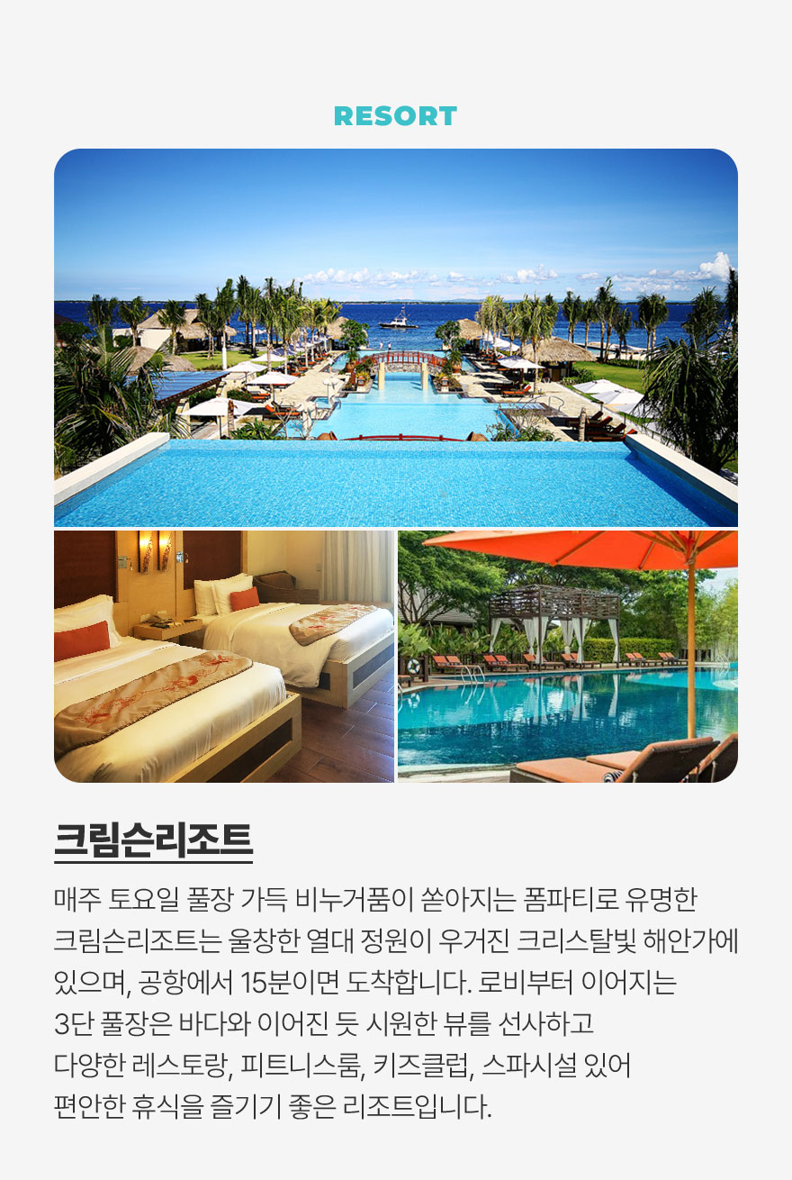 ※ 리조트 중, 석식 1일 1인 식사비용 1,250페소(약 3만원 상당/성인기준) 크레딧 제공