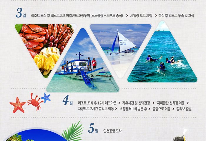 | 5 | 세일링보트 | 무동력 세일링을 타고 로맨틱한 시간을.. | $10 | 30분 | 자유시간 | 비치/리조트 자유시간 | 비동행 |