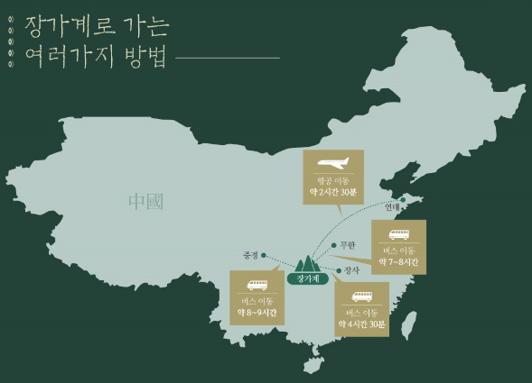 장가계는 현재 인천에서 직항 노선이 많지않아 다른 도시를 경유하는 경우가 많습니다. 중경에서 장가계까지 버스 이동 약 8~9시간, 무한에서 장가계까지 버스 이동 약 7~8시간, 장사에서 장가계까지 버스 이동 약 4시간 30분, 연태에서 장가계까지 항공 이동 약 2시간 30분 소요됩니다.