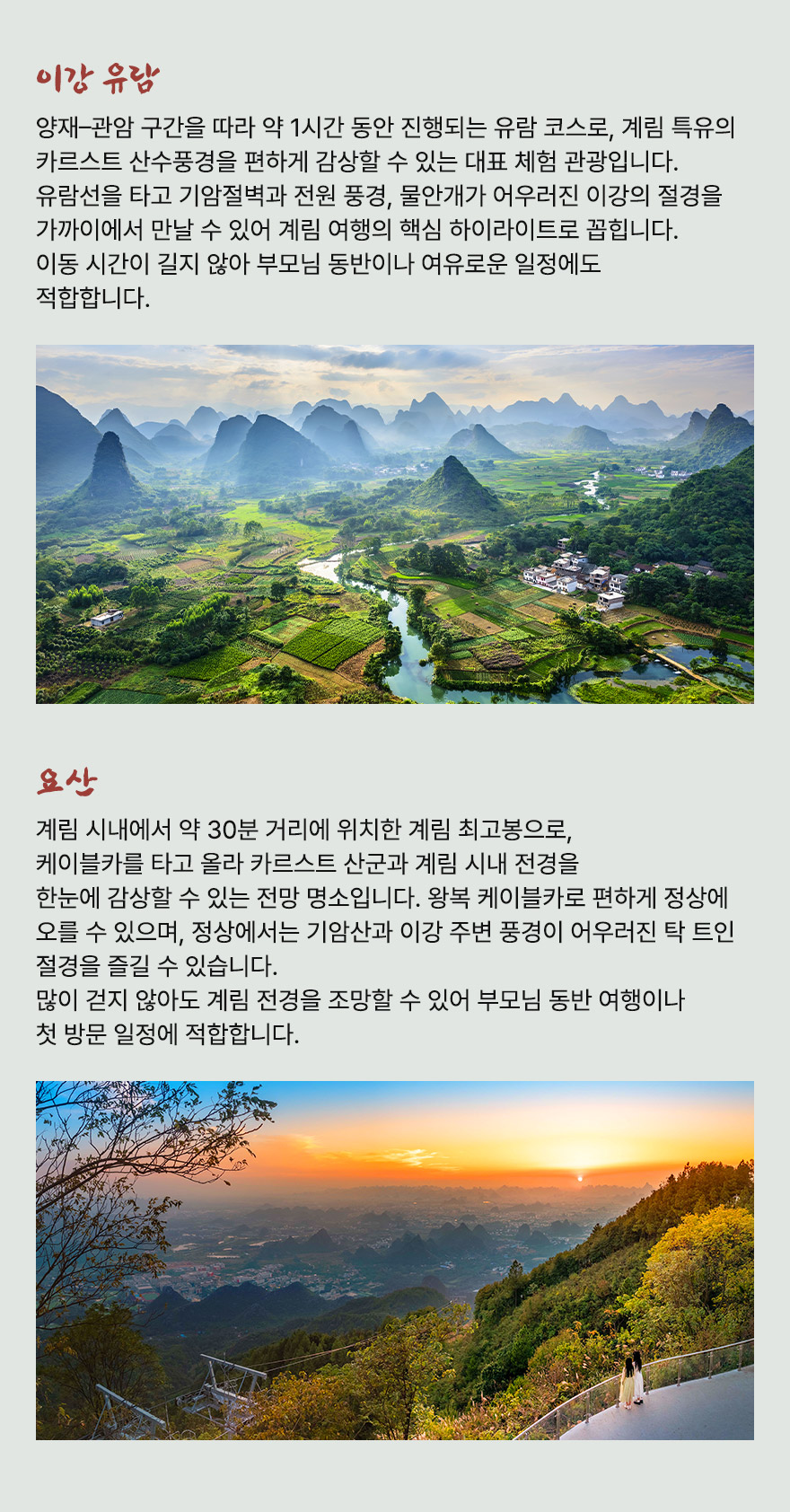 이강 유람 시 수량이 풍부해 풍경은 좋으나, 우비·우산 준비가 필요합니다.