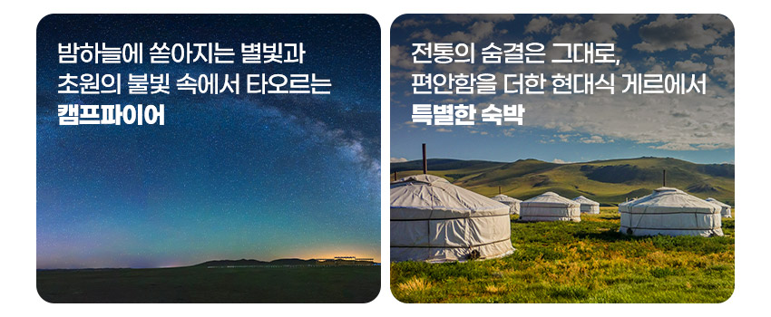 1. 기타 개인경비 및 매너팁 2. 3인 예약시 숙박시설별 객실 추가 비용 발생 ▶ 게르 3인1실 없음 - 게르 싱글차지 $53/1박 추가 ▶ 사막 그랜드크리스탈 호텔 트윈룸 더블베드 두개로 3명 사용가능 - 싱글이용시 $80/1박 |