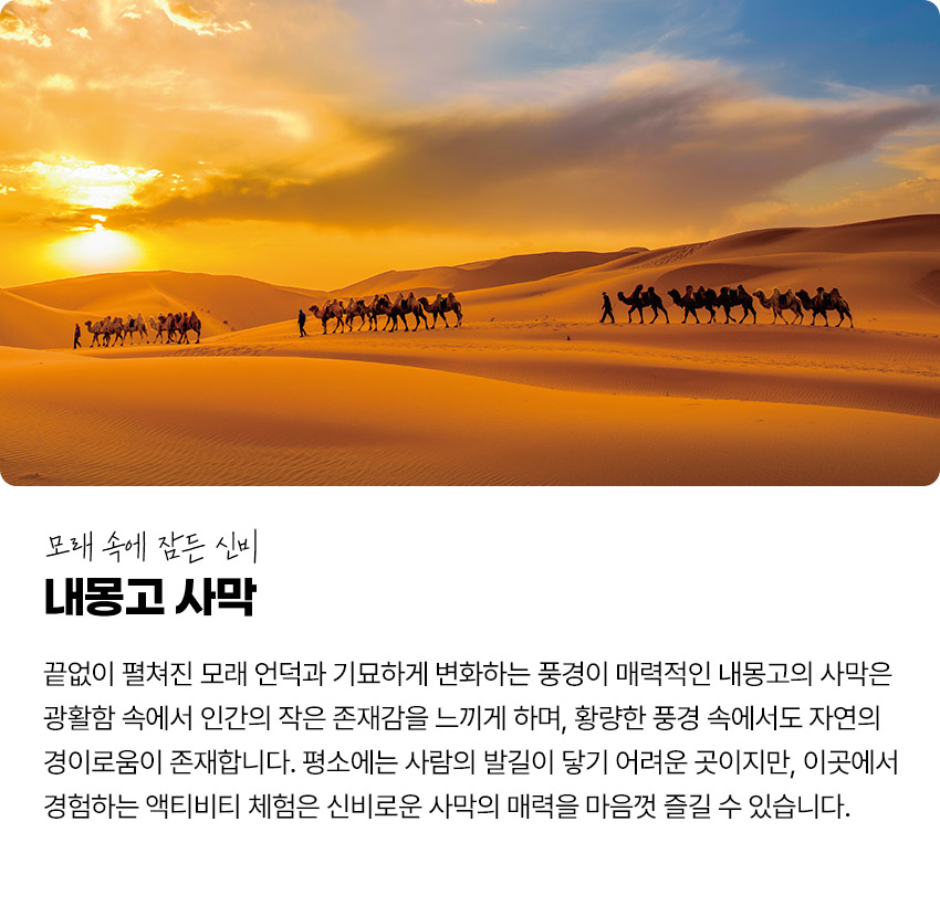 내용보기인컨타라사막 생태문화관광지는 오르도스시의 한개 사막풍경구로 사막생태문화와 초원문화가 일체화 된 국가 4A급 종합 관광지입니다. 인컨타라사막은 중국 4대 사막중 하나이자 세계적으로 유명한 사막중 하나입니다. 관광지는 음식숙박종합구, 사막놀이구역, 인컨오아시스구역, 인컨모래소리체험구역, 유엔사막화방지협약 체약국총회 분회의장, 인컨오포구역으로 구분합니다. 관광지에서는 사막관광체험, 모래소리체험, 사막에서의 야영, 기네스 몽고포에서 식사 및 공연 관람. 편안한 휴식을 위한 특별한 사막유리호텔을 체험할수 있습니다. 인컨타라사막관광지에서는 오포제사문화를 포함하여 사막썰매, 사막모터찌클, 사막짚라인, 낙타체험 등 다양한 놀이체험이 가능합니다.
