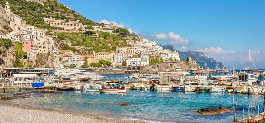 '돌아오라 소렌토로'라는 칸초네로 유명한 이탈리아 남부 휴양지로 포도주와 올리브유가 유명하며 기다란 해안선을 따라 지중해 바닷가 마을이 옹기종기 모여있습니다. 언덕 위에서 바라보면 길게 펼쳐진 해안선과 베수비오산을 배경으로 그림 같은 지중해 바다가 펼쳐집니다. 소렌토의 주요 생산물인 레몬과 오렌지는 상큼한 디저트와 향수 비누 등으로 관광객을 즐겁게 합니다.
