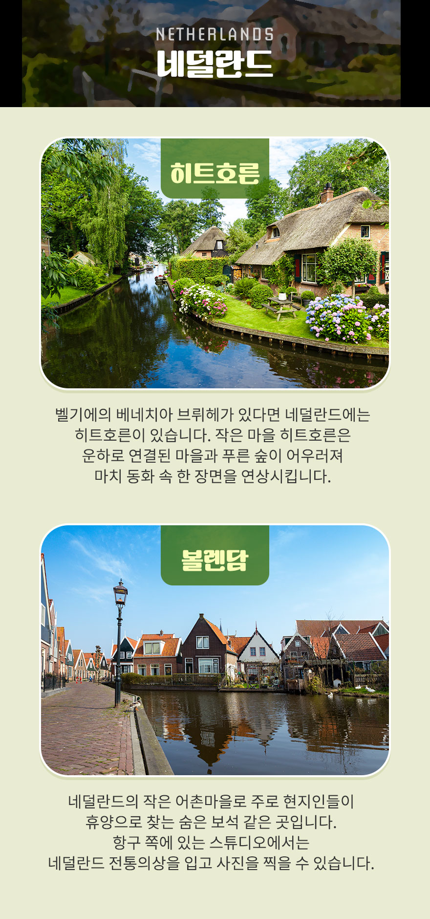 집이 대부분 흰 테두리의 목조 건물로 되어 있으며, 마을 곳곳에 크고 작은 풍차들이 흩어져 있어 마치 동화 나라 같은 분위기를 자아냅니다. 멋진 풍차를 촬영하려면 정면보다는 약간 측면을 촬영해보는 건 어떨까요? 정면은 바람에 돌아가는 날개만 보이지만, 측면은 아름다운 풍차를 다 촬영하실 수 있습니다.
