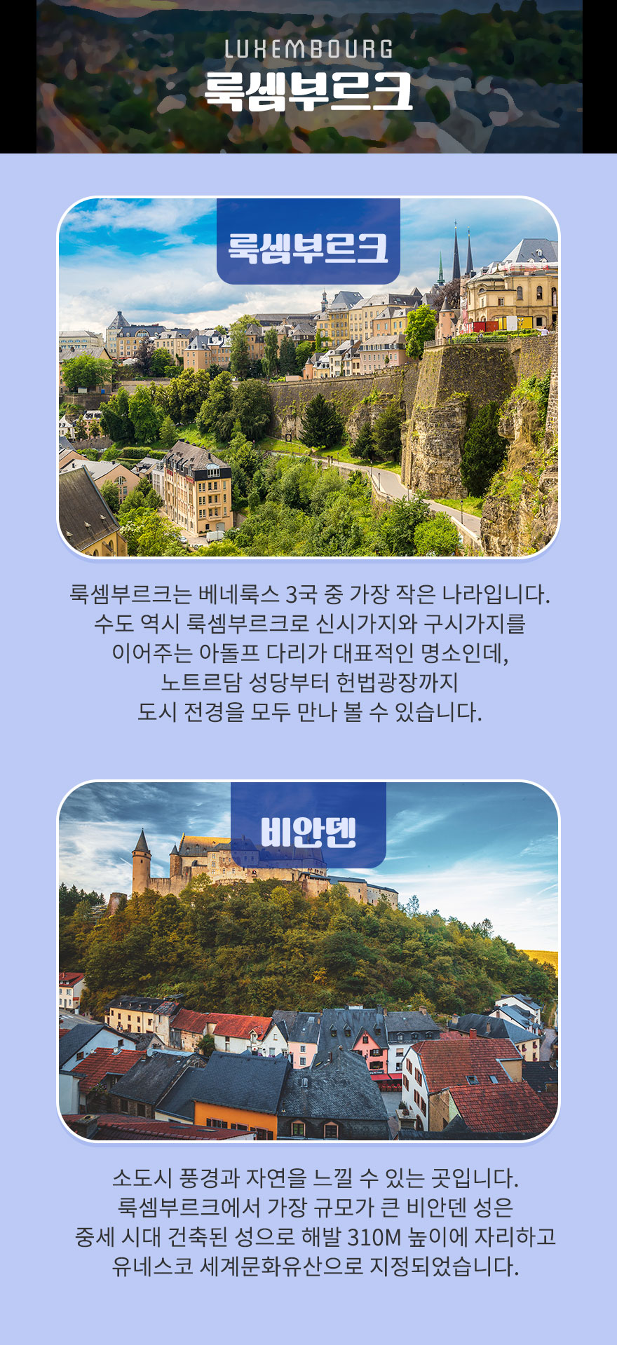 정식명칭은 룩셈부르크 대공국으로 동쪽으로는 독일, 북쪽과 서쪽으로는 벨기에, 남쪽으로는 프랑스에 둘러싸여 있는 내륙국입니다. 나폴레옹이 유럽의 골동품이라고 불렀던 작은 나라로 오랫동안 독립국의 위치를 유지하였으며, 중세 봉건제의 유물적 존재로서, 또 독일과 프랑스 사이의 완충국으로서 중요한 의미를 지닙니다.