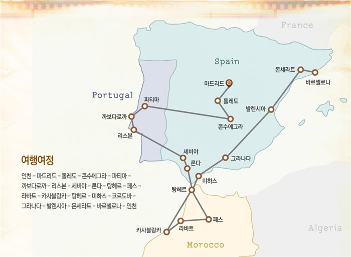 인천/헬싱키/마드리드(1)-똘레도-콘수에그라-마드리드(1)-살라망카-파티마(1)-까보다로까-리스본-세비야(1)-론다-타리파-탕헤르(1)-페스-라바트-카사블랑카(1)-탕헤르-타리파-말라가(1)-미하스-코르도바-그라나다(1)-발렌시아(1)-몬세라트-바르셀로나(1)/헬싱키/바르셀로나