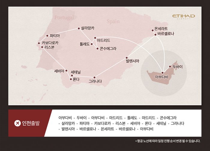 인천/두바이/바르셀로나(1)-몬세라트-발렌시아(1)-그라나다(1)-미하스-론다-세비야(1)-콘수에그라-똘레도(1)-마드리드/두바이/인천