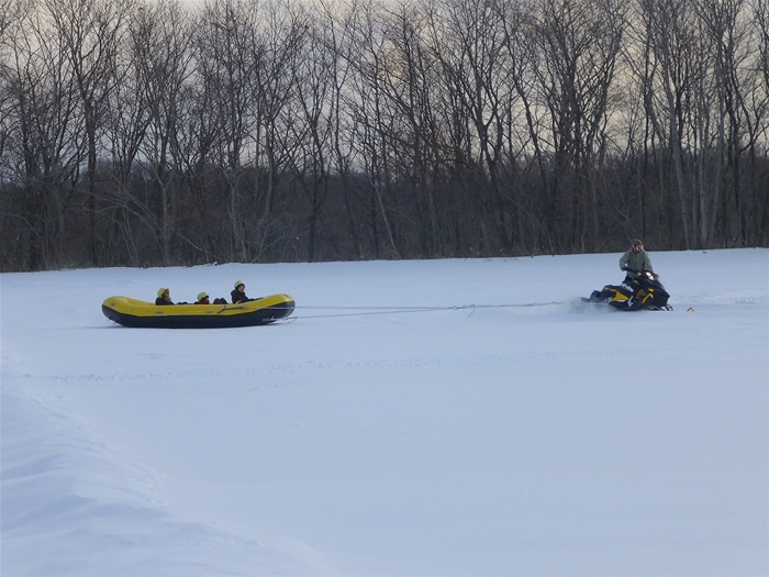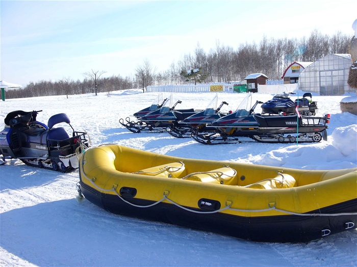 겨울기간동안 꽃밭이 눈에 뭍혀 "스노랜드"가 된 시키사이노오카에서 즐길 수 있는 스노라프트 바나나보트 체험 (약1km)