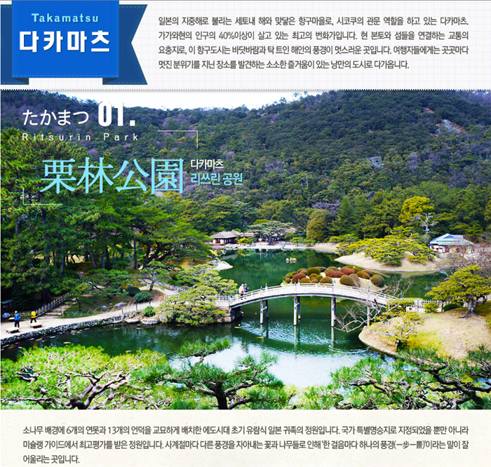 일본의 정원은 아름답기로 유명합니다. 일본인들은 정원 안에 자연의 모든 것을 축약시켜 집어넣었습니다. 그 정원의 나라 일본에서도 특별히 아름답다고 인정받고 있는 곳이 바로 리쓰린 공원입니다. 일본에서 국가 특별 명승지로 한 발자국 걸음을 걸을 때마다 보이는 풍경의 아름다움(一步一景の美しさ)을 자랑하는 공원은 소나무 배경에 6개의 연못과 13개의 언덕을 절묘하게 배치한 에도시대 초기풍의 유람식 다이묘 정원입니다.