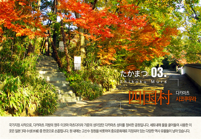 다카마쓰에 들르는 여행자는 대부분 다카마쓰 시내와 세토내해의 경관이 한 눈에 내려다보이는 야시마 전망대에 오릅니다. 야시마 드라이브웨이는 다카마쓰 시내 시코쿠 빌리지에서 야시마 절이 있는 정상까지 오르는 3.7킬로미터의 도로를 말합니다. 그리 높지 않은 산을 오르는데도 커브를 돌때마다 눈앞에 펼쳐지는 푸른 세토내해와 섬들의 전경이 감탄을 자아내게 하는 곳입니다. 이 길은 걷거나 자전거, 오토바이로는 올라갈 수 없기 때문에 렌터카를 빌리거나 관광버스로 보는 것이 좋습니다.