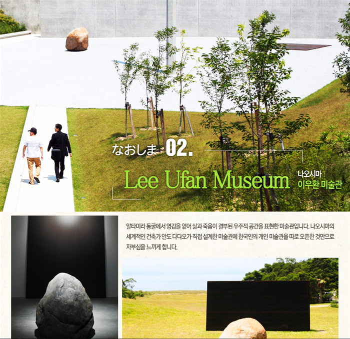 세계적 여행전문지 트래블러에서 죽기 전에 가보고 싶은 세계 7대 명소로 선정. 일본 예술이 숨 쉬는, 건축과 자연 그리고 예술과 문화의 나오시마 [ 直島 ] 과거 숭덕천황이 섬사람들의 순수함에 반해 나오시마란 이름을 붙였다는 이곳은 지금은 섬 자체가 하나의 거대한 예술 작품이라고 해도 과언이 아닙니다.