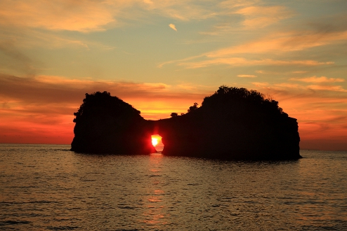 시라하마의 상징인 엔케츠 섬(토 또는 시마)은 원형의 파도의 마찰로 생긴 굴(海触洞)이 특징인 간사이지역 최고의 석양 관광지입니다. 시라라하마 해수욕장은 약640m에 달하는 백사장 리조트로 하와이의 와이키키 해변과도 자매결연을 맺고 있습니다. 센조시키는 거친 파도에 의해 만들어진 돌계단으로 조각같은 광경이 눈앞에 펼쳐집니다.