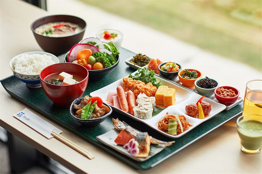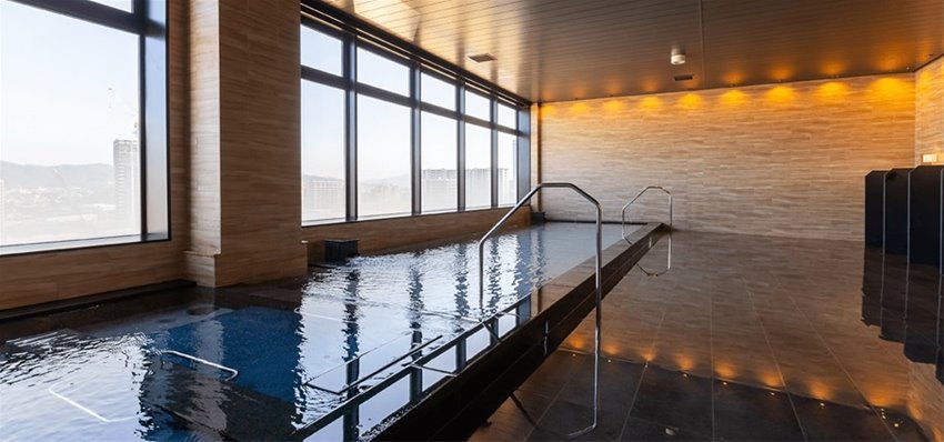 후쿠오카 아일랜드시티의 전경이 내려다 보이는 대욕장 시설과 후쿠오카산 재료를 사용한 약 30종류로 구성된 조식 뷔페를 즐길 수 있습니다.