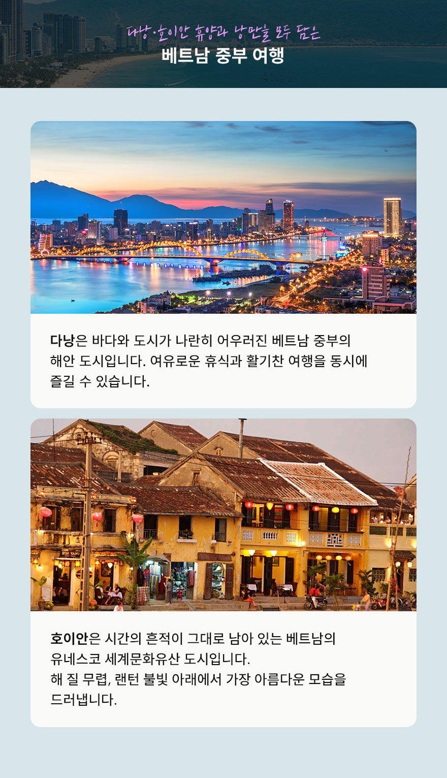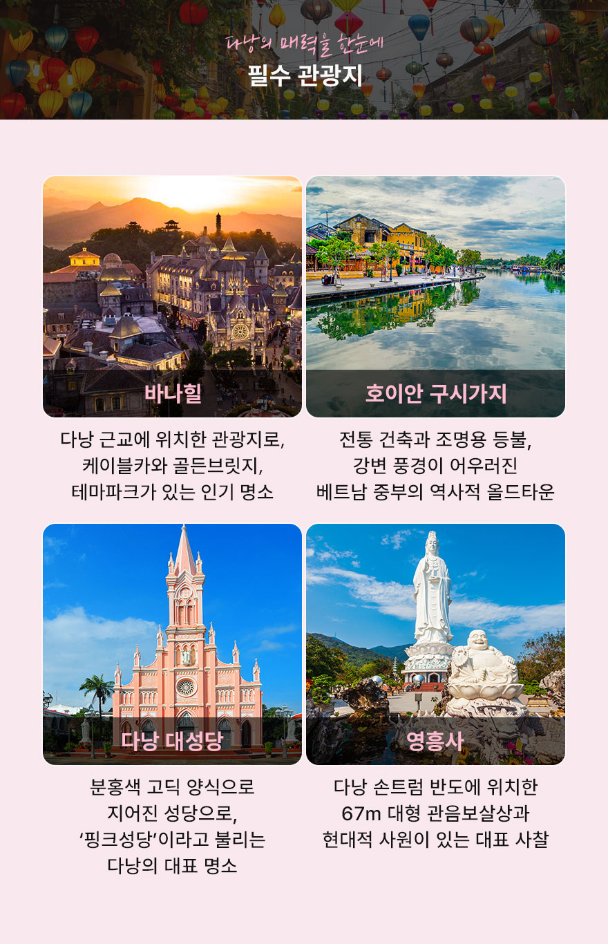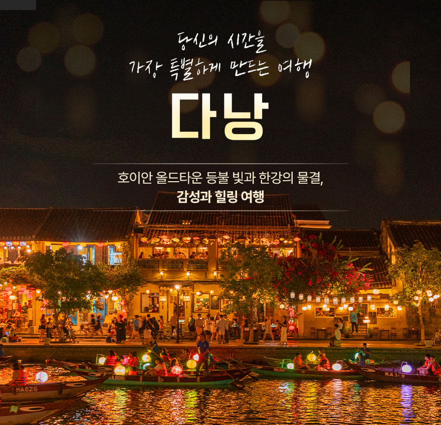 - $40상당 바구니배 체험, $50상당 야간호이안씨클로탑승, $40상당 차밍쇼관람, $40상당 아로마 스톤마사지, $30상당 한강 유람선 탑승)
