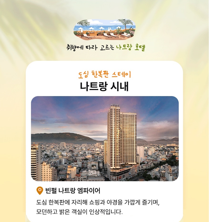 | 5 | 나트랑 바비큐 | 다양한 바베큐와 각종 해산물 요리를 한번에 드실 수 있는 기회 | $40/1인 | 2시간 | 호텔 내 자유시간 | 호텔 | 현지가이드 미 동행 |