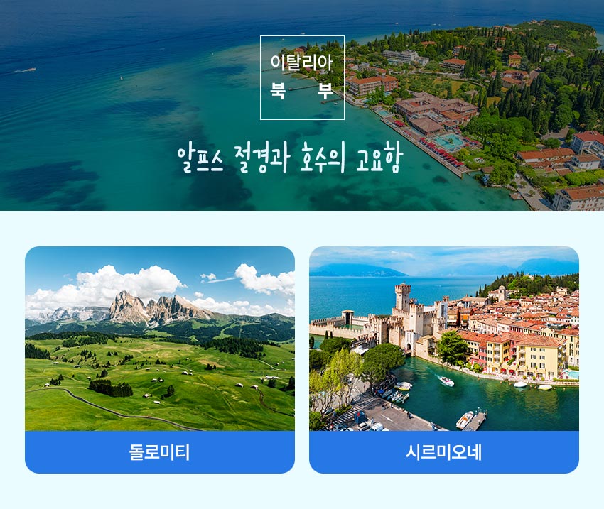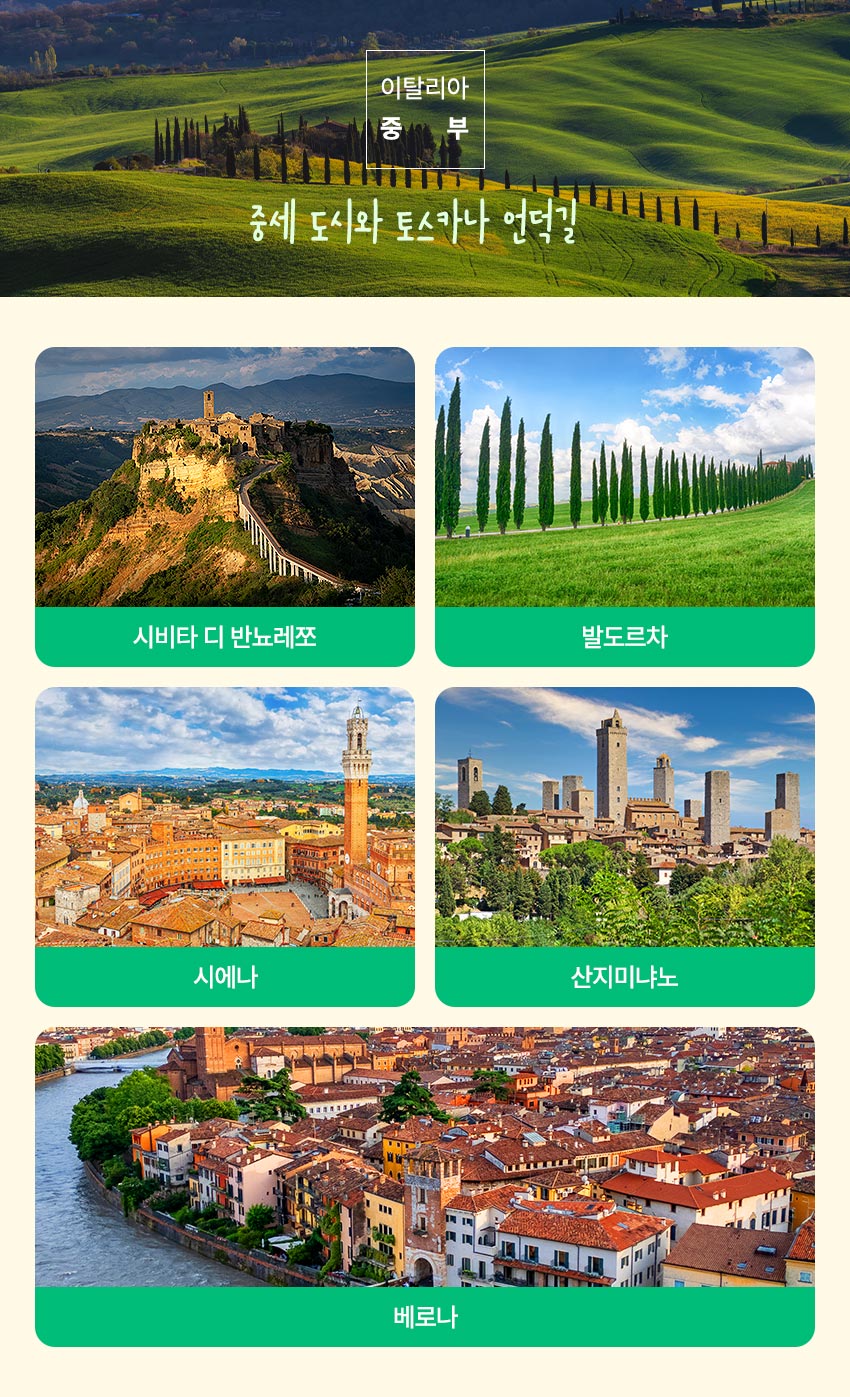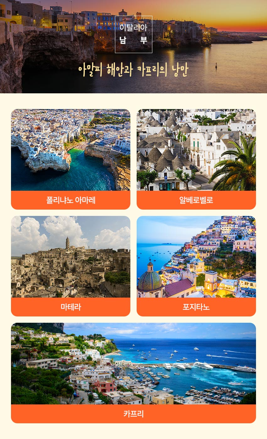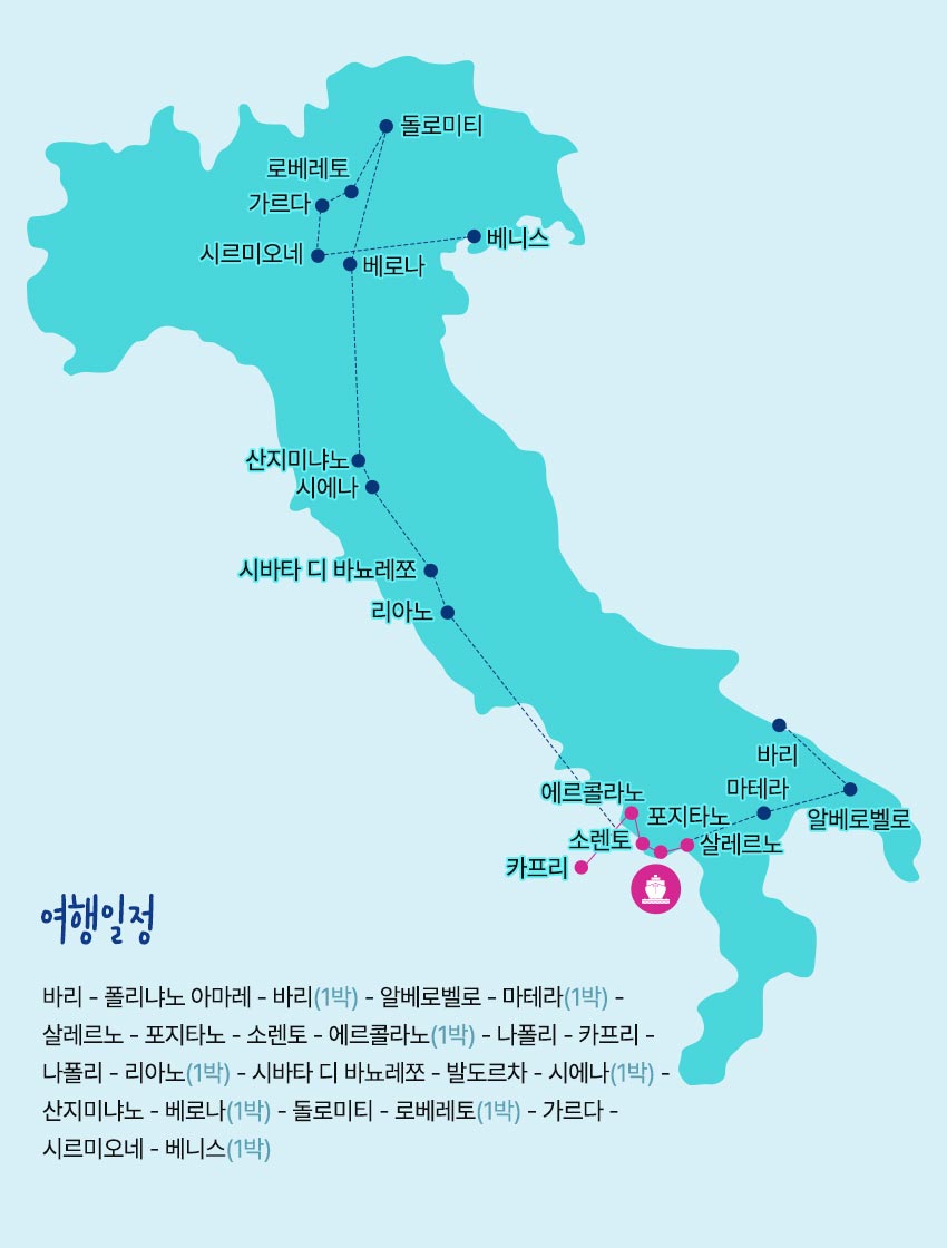 바리-폴리냐노 아마레-바리(1박)-알베로벨로-마테라(1박)-아말피-포지타노-나폴리-에르콜라노(1박)-나폴리-카프리-나폴리-리아노(1박)-시바타 디 바뇨레쪼 -발도르차-시에나(1박)-산지미냐노-베로나(1박)-돌로미티-로베레토(1박)-가르다-시르미오네-베니스(1박)