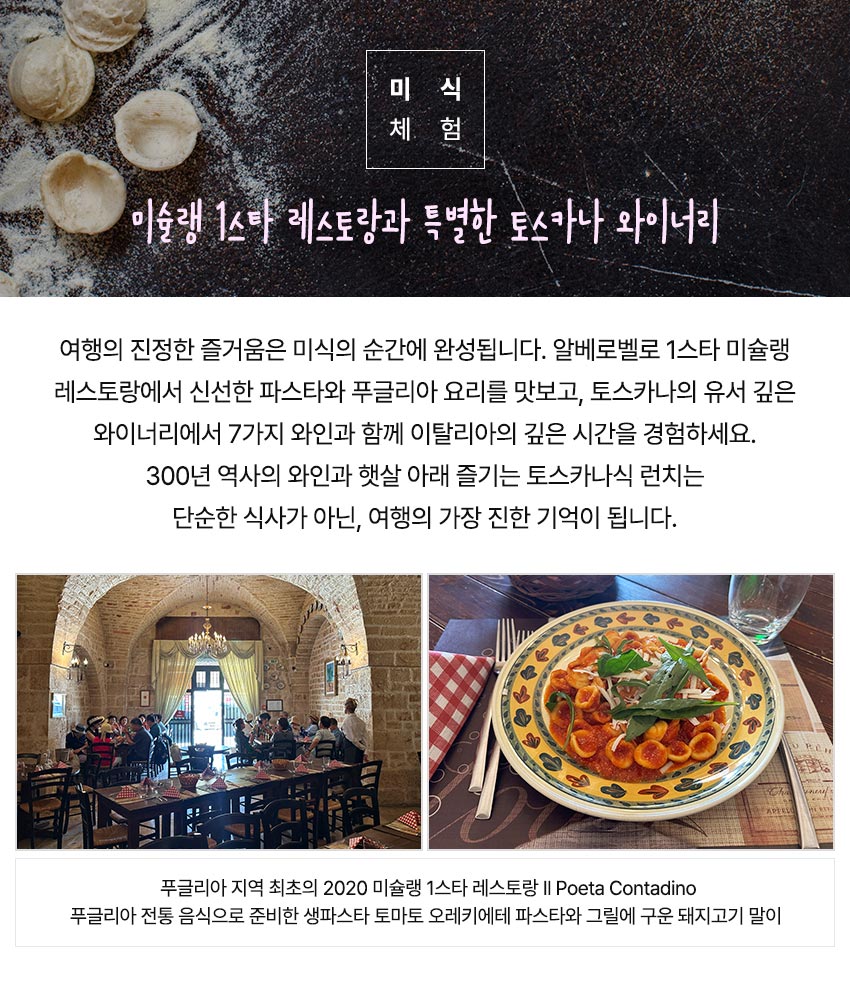 | 1. 왕복항공요금 및 제세공과금 2. 유류할증료 (매월 마지막 화요일 기준) 3. 일정상 표기된 식사 및 관광지 입장료 - 알베로벨로 미슐랭1스타 레스토랑 - 토스카나 7종 와인 테이스팅과 런치 코스 4. 투어리스트급 또는 일급 호텔 숙박 (2인 1실 기준) 5. 전문 인솔자 전 일정 동행 6. 최고 1억원 해외여행자 보험 ※ 하단 참고사항 내 여행자 보험 설명 참조 | 1. 가이드, 기사 경비 현지 지불 100유로/인(성인, 아동 동일) 2. 자유시간시 개인 관광 및 개인 비용 (물값, 매너 팁 등) 3. 유류할증료 변동에 따른 증감분 (매월 변동/출발일 기준 적용) 4. 국외여행 표준 약관 제11조 여행요금의 변경 참고 - 국외여행을 실시함에 있어 이용운송, 숙박기관에 지급 해야 할 요금이 계약체결시보다 5%이상 증감하거나 여행요금에 적용된 외화환율이 계약체결시보다 2%이상 증감한 경우 여행사 또는 여행자는 그 증감된 금액 범위 내에서 여행요금의 증감을 상대방에게 청구할 수 있습니다. ※ 현지사정에 따라 시간과 일정은 변동 될 수 있으며 상세 일정표는 출발 1주일 전 마이페이지를 통해 확인하실 수 있습니다. |