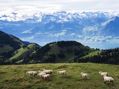 리기산의 별명은 '산의 여왕'입니다. 여왕은 고개 숙이지 않습니다. 해발 1,800미터 밖에 안되지만 근처의 모든 알프스 산들을 내려다보는 자리, 짙푸른 루체른 호수가 한 눈에 들어오고 그 양쪽으로 신하들처럼 고개 숙이고 있는 초록 언덕과 들판이 완벽한 파노라마를 이루는 곳이 바로 리기산입니다.