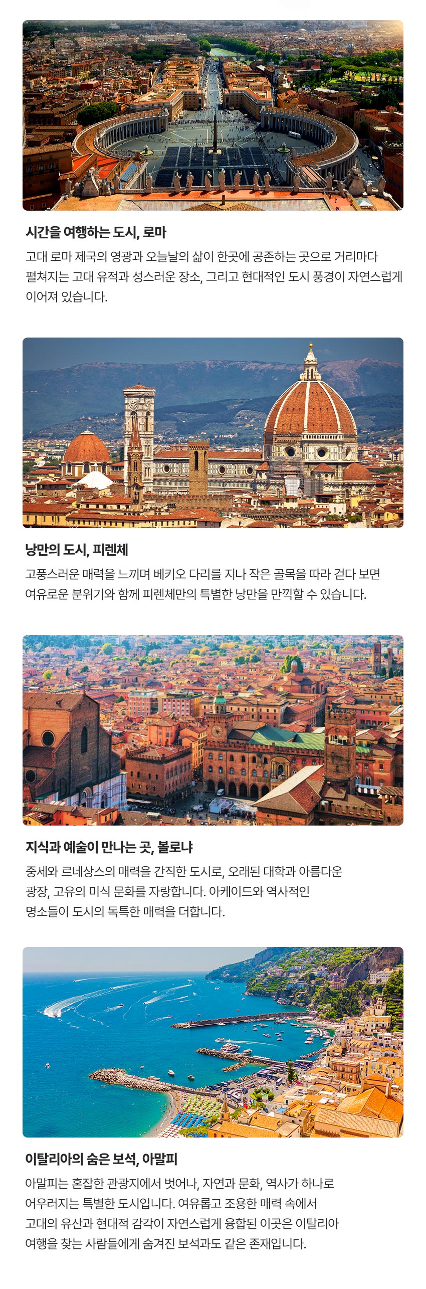 | 4 | 아말피 마을투어+유람선 | 유람선 탑승 및 아말피 마을투어합니다. ( ※ 기상 상황에 따라 유람선 탑승이 불가할 시, 인근 마을 방문으로 일정이 대체될 수 있습니다.) | 90유로 | 약2시간 | 주변 자유시간 | 주변 관광지 | 동행 |