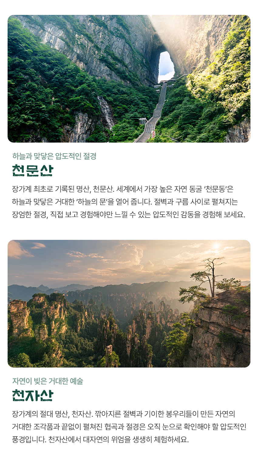 천문산 정상에 위치한 천문산사는 당나라때 건축되었습니다. 천문산사에서 장가계시내와 무릉원 풍경구가 한눈에 들어오며, 가는길목인 귀곡잔도 옆쪽으로는 낭떨어지가 아찔하게 펼쳐져 있습니다. 귀곡잔도 중간에 위치한 유리잔도는 절벽아래의 풍경을 유리를 통해 직접 내려다 보며 걸을수 있어 색다른 즐거움을 선사합니다.