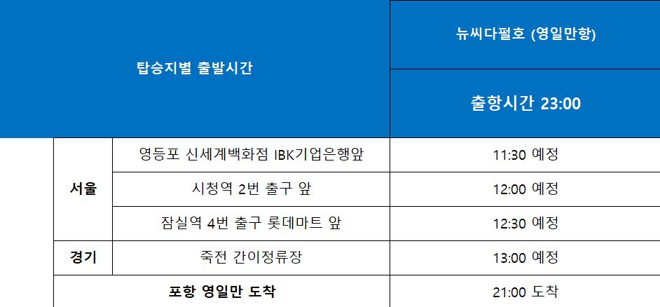 | 서울권 ↔ 포항 영일만 버스이동 (셔틀버스 포함) | 320,000원 | 옵션변경 |