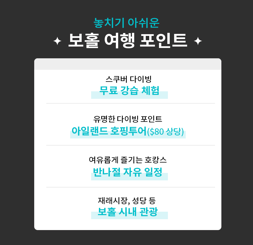 | 11 | 체험다이빙 (나팔링 포인트) | 세계 유명 다이빙 포인트 보홀에서 아름다운 열대어들과 만날수 있는 해저탐험. 수영을 못하시는 분들도 2명당 1명씩의 전문 강사들이 친절하게 직접 지도를 해드리며 누구나 쉽게 다이빙의 세계를 경험하실수 있는 절호의 기회. 수만 마리가 한꺼번에 몰려다니며 덩치큰 물고기와 맞서는 용감한 정어리떼. (입장료 포함) | $150 | 1시간 | 주변 자유시간 | 미정 | 미동행 |