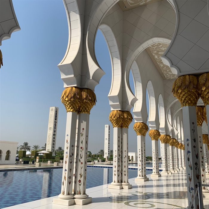 82개의 돔과 1천개의 기둥이 모두 이탈리아에서 직수입된 대리석으로 만들어진 순백의 건축물이어서 햇빛을 받고 있는 모습이 너무나도 아름다운 그랜드모스크는 단순히 관광지로만 쓰이는 것이 아닌 실제 사용하는 사원이어서 건물 내부에 코란이 배치되어 있습니다. 내부 또한 외관 못지 않은 어마어마한 규모를 자랑하는데 4만 명의 이슬람인들이 동시에 기도를 드릴 수 있고, 그 곳에 당당히 자리하고 있는 세계 최대 규모의 샹들리에 또한 멋지게 빛나고 있습니다. 상상보다 훨씬 더 거대한 규모와 그 휘황찬란한 아름다움에 눈이 휘둥그레집니다.