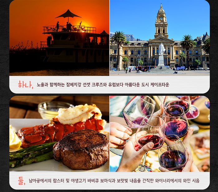 ◈ 왕복항공권 (인천공항세, 관광진흥기금 포함) ◈ 전일정 호텔 및 식사/ 관광지 입장료 포함 ◈ 1억원 해외여행자 보험 ◈ 15명 이상시, 인솔자 동행 조건입니다 (남아공: 한국인가이드 보츠와나, 잠비아, 짐바브웨: 영어가이드) |